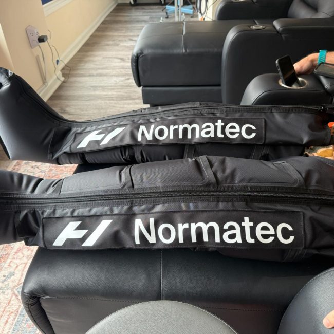 Normatec compression therapy is an advanced recovery system that uses dynamic air compression to enhance blood flow, speed up recovery, and reduce muscle soreness. The device consists of specialized sleeves that are worn on the legs, arms, or hips. Once activated, it inflates and deflates in a sequence that mimics the body’s natural muscle pump, helping circulation and accelerating the removal of lactic acid and metabolic waste.